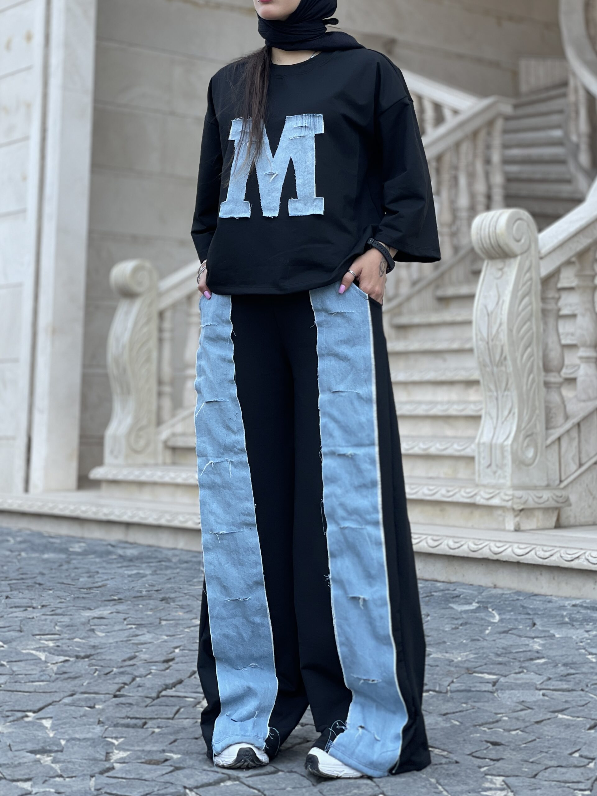 ست تیشرت شلوار star (4): متغیر های محصول: رنگ:مشکی سایز: فری سایز(مناسب36تا44) توضیحات بالا تنه: جنس :دورس(ستاره ها جین هست)